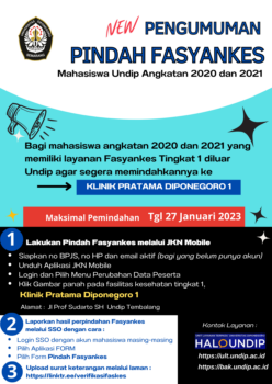 As a follow-up to the announcement of the Chancellor of Diponegoro University Number 2 / UN7.A1 / KM / I / 2023, we hereby convey matters related to the transfer of Health Service Facilities to the Diponegoro I Primary Clinic for students class of 2020 and 2021. Complete information is available. Download Here The stages […]